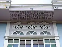 At the exterior of the house, intricate carvings decorates the corbels, brackets and pilasters. A simple yet elegant roof parapet decorated with five pointed stars can be seen on the top of the house.