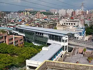 The station is 83 meters long and 21.5 meters wide, while the platform is 93.5 meters long.[3] Because of the station needed to go over the Wufen Road footbridge, the station height is 20 meters (the equivalent of a six-story building). It has thus been called the "Zenith Station" and is the highest station on the Taipei Metro.