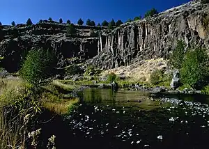 In 1988, 72.7 miles (117.0 km) of rivers in its basin were designated Wild and Scenic, and another 14.8 miles (23.8 km) were added in 2000.[7] The Oregon Department of Environmental Quality (DEQ) lists seven temperature impairments on the river system.[15] The maximum recorded flow of 4,270 cubic feet per second (121 m3/s) occurred on April 26, 1978, and was extrapolated from a calibrated value of 1,900 cu ft/s (54 m3/s). The minimum recorded flow 4.2 cu ft/s (0.12 m3/s) occurred December 9, 1972, caused by widespread freezing.[16]