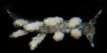 Body is narrow and elongate.[1] Rhinophores are smooth with tight rhinophoral sheaths.[1] Cerata are with rounded tubercles; apical tubercles are much larger than the rest.[1] Cerata are spaced out along the dorsum.[1] Background color is translucent gray with a series of opaque white spots on the dorsum.[1] Cerata are with cream or white extensions of the digestive gland.[1] The body size is up to 4 mm.[1]