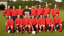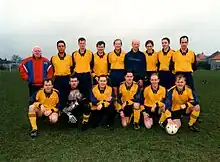 Douglas and District (in yellow) in an Isle of Man FA Cup match against Douglas High School Old Boys F.C. during the 2008–09 season