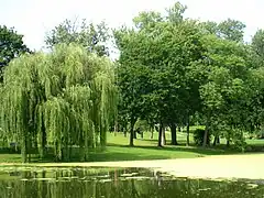 The most prominent feature of the park is the pond and fountain in its southwest corner, known as the "polly." In the early 20th century, it was a popular place for ice skating in the winter, but that has since been prohibited as pollution has made the water less capable of effectively freezing up in the winter. The Polly’s natural stone Shelter House, designed by local architect Gordon Marvel was added in 1934 and served as a place for visitors to change into skates and enjoy cups of hot chocolate during the cold winter months. It is now the headquarters of the Downing Park Planning Committee.