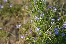 Downingia is a genus of 13 annual plants native to western North America and Chile. Commonly known as calico flowers, they are notable for forming mass displays of small but colorful blooms around vernal pools. A number are uncommon endemics in California.
