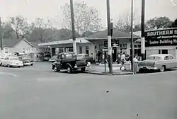 The Downtown Chevron Station was a historic service station in Huntsville, Alabama. Built in 1919, it was one of the first buildings in the city tailored to the automobile. The center section of the station was built of brick in a style similar to other commercial and residential buildings in the area. The windows were large panes topped with three vertical panes (a style commonly seen on bungalows), and the main entrance had a similar transom. The hipped roof extended from the building towards the corner of Clinton Avenue and Greene Street, providing cover for the pumps. Flat-roofed service bays with multi-pane sash windows were added along the Clinton Avenue side in 1929 and 1938.[2] The building was listed on the National Register of Historic Places in 1980.[1] It has been demolished since its listing, and a modern office building is on the site.