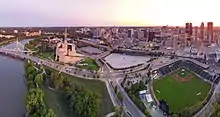 Panorama of Downtown Winnipeg. From left to right: The Forks, Broadway-Assiniboine, South Portage, Portage and Main. (The Exchange and Waterfront districts are located farther to the right and front.)
