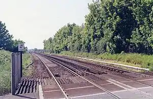 ![]() The site of the station, looking west from the level crossing, in 1992 | |