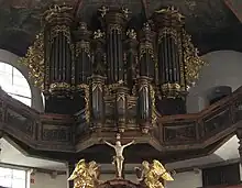 The organ of the Trinity Church is located above the altar in the historical prospectus built by Christian Dathan around 1716 for the first organ of the church. The instrument was built in 1929 by the organ building company Steinmeyer (Oettingen), using pipe material from the predecessor organ from 1812, which had been built by Johann Georg Geib (Frankenthal). Today the organ has 41 stops, divided into three manuals and pedal. The instrument has electropneumatic tracker action.[11]