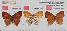 - ↑ Felder, C. & Felder, R. 1865–75. Rhopalocera. In Reise der Osterreichischen Fregatte Novara um die Erde in der Jahren 1857, 1858, 1859 under den Befehlen Commadore B. von Wüllerstorf-Urbair. Zoologischer Theil. Zweiter Band: Abtheilung. Vienna, 549 pp., 140 pls.