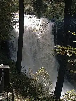 The falls has been called Dry Falls for a long time, but has also gone by a few other names, including High Falls, Pitcher Falls, and Cullasaja Falls.[3] It received its name because supposedly, you can walk behind the falls and stay dry, however this is only true in periods of low flow.
