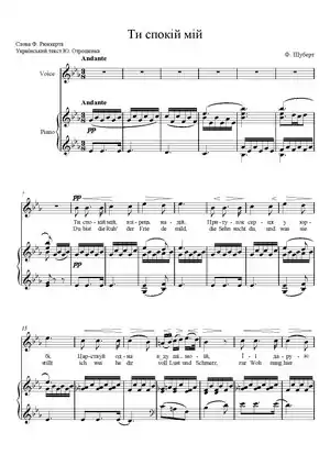 The simplicity of the melody makes this piece that much more difficult to sing as it requires perfect legato and breath control. Any inconsistencies in the sound can disrupt the 'peace' of the poem. Schubert sets tender and gentle themes to Rückert's words, and the simplicity of the piano line further enhances the meaning of the song. The progression of the harmonies repeat with the bar form, always establishing the key of the piece. With a pianissimo and larghetto marking and the piano part light in texture, Schubert sets up the poem for the first few lines, "You are the calm, the mild peace", in the introduction.