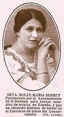 In 1915 Dulce María Serret was award a scholarship by the Havana city council to study in Spain at the Madrid Royal Conservatory. She studied under José Tragó and won the prize of honour at the Conservatory.[4] She graduated in 1917 and performed before the royal family. She performed throughout Spain and Portugal in large venues in major cities. At the age of 22 she moved to France in 1920 and attended the Schola Cantorum de Paris, where she studied romanticism and ancient and modern music.[1] In Paris she was taught by Édouard Risler.[2]