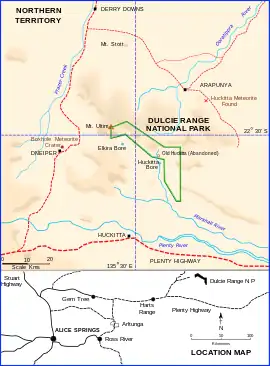 Dulcie Range is a national park in the Northern Territory of Australia, 220 km north-east of Alice Springs and 1235 km southeast of territorial capital of Darwin.[2][3] The park lies along the south-western edge of Dulcie Range. It was first declared in 1991 and again in July 2012.[4] A draft Plan of Management was published by the Parks and Wildlife Commission of the Northern Territory in May 2001.