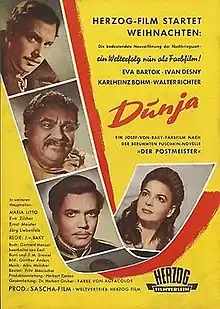 Dunja is a 1955 Austrian historical drama film directed by Josef von Báky and starring Eva Bartok, Karlheinz Böhm, Ivan Desny and Walter Richter.[1] It is an adaptation of the shorty story The Station Master by Alexander Pushkin, which had previously been made into the 1940 film Der Postmeister by Gustav Ucicky.[2]