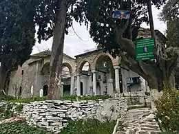 The tekke is located on a spur of the nearby mountains, with a good view over the Thessalian plain.[1] As was usual for both Christian and Muslim monasteries, it is surrounded by a wall for safety, reinforced with towers and crenelations.[1] A water spring is at the entrance of the complex, which comprises two large and distinct areas, in turn surrounded by walls: the cemetery in the south, and the residential area in the north.[1][3] The residential area included stables, a kitchen, storage rooms, guest houses, and a building for the ritual purification of prospective abbots. Most of these buildings are in a ruined condition today.[1] The cemetery comprises two türbes and 33 tombs.[1] The western türbe is the oldest, with dimensions of 6×7×7,5 m. Its masonry is of irregular ashlar blocks surrounded by bricks, which according to some scholars dates it to the 16th century. Byzantine spolia were also used in its construction.[1] The eastern türbe is of similar dimensions and houses three tombs. The two türbes are linked by a low modern cement structure that houses two tombs.[1]