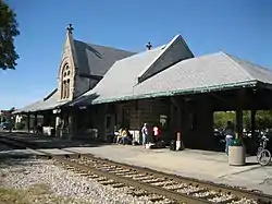 Built by the Chicago and Alton Railroad in 1891, the structure, designed by Henry Ives Cobb in the Richardson Romanesque style of rusticated masonry, has been on the National Register of Historic Places since December 27, 1982.[1] The foundation is of Joliet stone and the walls above are of Bedford blue stone from Indiana composed almost entirely of fossil shells.[2]