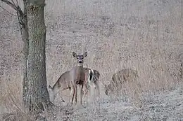 Clockwise from upper left: The park in October 2009, American white pelicans flying at the park's bird sanctuary, deer grazing in the park, a picnic shelter and directional sign, and a lakeside trail.