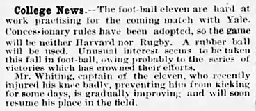 News about the Harvard v Yale game played under the "concessionary rules" in 1875