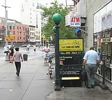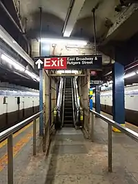 In June 2018, improvements to the East Broadway station's exits were proposed as part of the development of the controversial 247 Cherry, 269 South Street, and 259 Clinton Street skyscrapers. The developers planned to create an entrance at the northeastern corner of Rutgers and Madison Streets by reusing part of the existing closed exit and creating a new street stair parallel to Madison Street from the passage.[12] In addition to a new exit, the developers planned to make the station compliant with the Americans with Disabilities Act of 1990 with the installation of elevators.[13] The plan was approved that December,[14] but the developments were blocked by a New York Supreme Court judge in February 2020, making the proposed improvements unlikely to occur.[15]