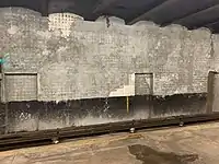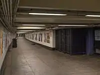 The unused space runs for no more than 15 feet (4.6 m) before ending at a solid wall. Another door that leads to the electrical room hides the eastbound trackway. Near the north end of this station, a different ceiling structure angling across marks where the unbuilt subway would have gone.[22] The ramp that descends from the full-time side would have led to the same intermediate level, with a station facility in between, but that was never constructed. On the open intermediate level's mezzanine, the unusual spacing of some of the pillars marks where the line's platforms would have been placed.[23][24]