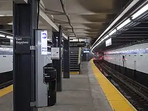 There are many closed sections at East Broadway, including restrooms that have been converted to office spaces. Inside fare control, the open intermediate level's mezzanine is split into two halves; the portion between the two halves was shuttered and is now used as maintenance space. Right below the open intermediate level is an entire closed intermediate level mezzanine, which is indicated by a brief intermediate level on staircases from the open mezzanine to the platform and now serves as storage space as well.[20] This closed mezzanine is accessible through fenced-off stairways at the either end of the station.