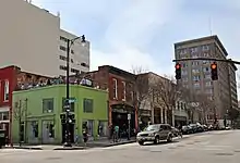 Development on the street slowed after the end of World War II in 1945.[14] In the 1960s, commercial activity moved away from downtown Raleigh, as more people began to shop at new malls and shopping centers[22] and by the middle of the decade East Hargett Street had begun to economically decline.[32] Some black businesses consolidated or fell under corporate ownership, while other merchants moved their operations elsewhere in search of more space. Black consumers, due to improved civil rights, were also able to shop in more places.[33] The Lightner Arcade underwent a series of ownership changes until it burned down in June 1970.[34] The Delaney family sold their building that year to a black physician, who converted the first floor of the structure into a restaurant.[35] By 1982 many of the buildings on East Hargett were vacant and the Royal Theatre had been demolished, though some black businesses remained.[7] In 1985 the Delaney Building was listed as a contributing structure to the Moore Square Historic District.[36]