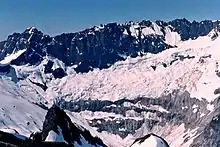 East Nooksack Glacier is in North Cascades National Park in the U.S. state of Washington, on the eastern slopes of Mount Shuksan.[2] East Nooksack Glacier is only 0.70 mi (1.13 km), but fills the upper portions of the Nooksack Cirque, spanning more than 2 mi (3.2 km). East Nooksack Glacier is connected to Crystal Glacier at its uppermost section at 7,800 ft (2,400 m).[2] East Nooksack Glacier extends from Nooksack Tower to the northwest to Seahpo Peak to the southeast and meltwater from the glacier flows into the Nooksack River.