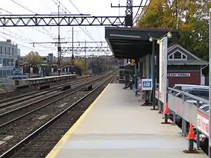 The station has two offset high-level side platforms, each four cars long, serving the outer tracks of the four-track Northeast Corridor.[8]: 21 The platforms are offset, with the westbound platform west of East Street and the eastbound platform to the east.