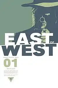 At the 2012 New York Comic Con, Image Comics announced East of West as one of the publisher's new titles in 2013.[1][2] The series reunited writer Jonathan Hickman and illustrator Nick Dragotta, who had previously collaborated on Fantastic Four for Marvel Comics. In an interview with Comic Book Resources, Dragotta recalled: "I remember a few email exchanges where we said we should work together again sometime, maybe do a creator-owned book. That was kind of it. It gestated for a little while when we worked on FF and our relationship grew tighter. We met at the last Image Expo and sat down for lunch. He told me he had this great idea for a Western, and I said I wanted to draw science fiction. We merged it into a sci-fi Western, and that's how the idea was born."[3] The first issue of East of West was released on March 27, 2013.[4]