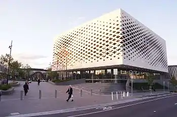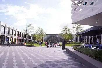 The expansion spans two levels for the most part, creating new south and east malls, with an outdoor alfresco dining and entertainment area surrounding the new Ringwood Town Centre and public library space on the third/ground level.[5] The expansion has a focus (after customer feedback on the existing mix) on creating more dining and entertainment options for the people of Ringwood, as well as introducing more high-end fashion options into the centre. QIC appointed Seventh Wave as Creative Directors for Stage 5 to oversee the expansion. The Realm Library, Town Square, David Jones and the Shard were designed by ACME, the Central Mall refurbishment and link malls were designed by Universal Design Studios and the East Mall was designed by Softroom. The redevelopment completed in two stages, the first stage opened on 29 October 2015 and the second stage opened on 5 May 2016.