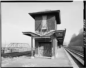 The Lehigh Valley Railroad opened its original line between Allentown and Easton in 1855; the first passenger train ran between the two cities on June 11. The Lehigh Valley's line ran across the Lehigh River from downtown Easton.[2] For the first year the Lehigh Valley used what the chief engineer Robert H. Sayre described as a "temporary passenger depot".[3] A permanent station, built by the CNJ on Lehigh Valley land, opened toward the end of 1856.[4] This new station had two levels: the upper level was used by the CNJ and Lehigh Valley, while the lower level was used by the Belvidere Delaware Railroad.[5] Sayre characterized this station as "combustible" and proposed replacing it with one made of stone.[6]