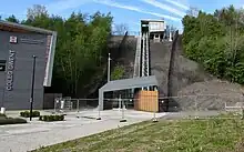 A kilometre-long funicular was part of the Garden Festival in 1992, but closed afterwards. In June 2015 a new inclined elevator, the Ebbw Vale Cableway, was opened.[24] The lift was built by ABS Transportbahnen (Doppelmayr Garaventa Group).[25] Its length is 57 metres (187 ft) and has a vertical lift is 24 metres (79 ft).[26][27] It has one car and operates from Monday to Friday, 7am to 7pm fully automatically, without attendants. The short, 20 second, journey is free to travel and it is intended to improve access between levels in the town, from 'The Works' site and Coleg Gwent, up to the town centre. The Works site is the site of the old steelworks and the current focus of much redevelopment for the area.