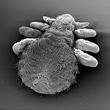 Lice in this family have a chaetotaxy characterized by three kinds of setae: spines, scales, and hairs. Different species have different arrangements of these setae. Species also have various egg-laying habits, with some laying them singly or in clusters, and some cementing them to the hairs of the host animal.[2] These lice have antennae but no eyes. In most species the middle and rear pairs of legs are larger with blunt claws while the front pair of legs is smaller with pointed claws.[3] Scanning electron microscope examination shows that the species Antarctophthirus microchir uses its larger middle and rear pairs of legs to cling to the hairs of its host, and the smaller, pointed front legs are probably sensory structures.[2]