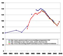 Evolution of the Belgian public debt as % of Belgian GDP