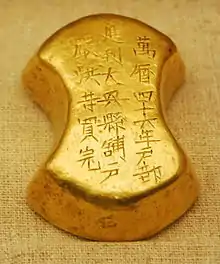 A gold ingot excavated from the Dingling Mausoleum, the tomb of the Wanli Emperor (r. 1572–1620)