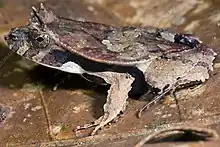 Similar to many other frog species, female Perez’s snouted frogs (E. perezi) are larger than males. Males are on average 28-36 mm in size and the females are 35-40 mm. The general color of this frog is very similar to leaf litter, which is a cryptic color protection in its habitat. Dorsum skin color is brown and there are usually many random dark brown markings on the back, such as tubercles and longitudinal ridges. Distinct characteristics of this frog include its eyelids, which have conical tubercles growing around the edge, a vertical ridge between the eyes, and the underdeveloped vomerine teeth.[2] The iris is bronze and has some radiating grayish-brown lines. The body is a concaved shape with the spine dips down, differentiating the species from its sister taxon. The ventral side is smooth and white, with large black dots at lateral and posterior areas. The limbs are barred and the groin has an orange color decorated with black dots. It has unwebbed toes as a terrestrial frog species, and the first and second toes are of equal length.[4] The snout of this frog is pointed, but the mouth part of the other species E. nasuta in the same genus looks sharper because of a long, fleshy proboscis. This sister species also differs from E. perezi by having smaller eyelid tubercles.[2] A similar species from another genus is Physalaemus petersi, which also has an orange groin, but this species doesn’t has eyelid tubercles and has a different black and white belly pattern. P. petersi also has a gray throat and chest that is also different from the Perez’s snouted frog.[5][4]There are several small but marked differences between them and their closely related species.[5]