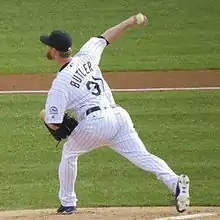 The Rockies invited Butler to spring training in 2014.[12] They assigned him to Tulsa to start the 2014 season,[13] and he started Tulsa's season opener.[14] After he pitched to a 2.49 ERA with 40 strikeouts and 19 walks in 68+23 innings pitched, the Rockies promoted Butler to the major leagues for his debut on June 6.[15] He recorded a loss in his first start, pitching 513innings and giving up 6 runs on 10 hits.[16] He was placed on the disabled-list before his next scheduled start with right shoulder inflammation, and he was replaced by Tyler Matzek, who would be the third starting pitcher to debut for the Rockies in six days, along with Butler and Christian Bergman.[17]