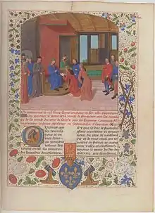 Edmund surrenders to Charles VII at Rouen in 1449. Illuminated page from the Anciennes chroniques d'Angleterre, Jean de Wavrin.[4]