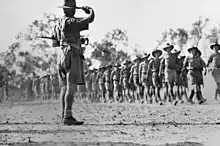 On 6 October 1939, Herring was informed that Major General Sir Thomas Blamey had decided to appoint him as Commander, Royal Artillery, of the 6th Division, of the new Second Australian Imperial Force (AIF) being raised for service overseas. A week later, Herring was promoted to substantive colonel and temporary brigadier, and given the AIF serial number VX15. His first task was to organise his new command, which was equipped with World War I vintage 18 pounder guns and 4.5 inch howitzers. Herring left for Palestine on 15 April 1940, along with the 6th Division's commander, Major General Iven Mackay and his headquarters. Training was difficult as the old ammunition was in short supply. His command was only partially reequipped with the new 25 pounders before being committed to the Western Desert campaign in December 1940.[21]