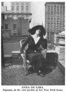 Edna de Lima first sang at New York's Aeolian Hall in 1916.[9] She made her Chicago concert debut in 1917, when a reviewer declared that "Nature has been bounteous to Mme. de Lima in the bestowal of personal attractiveness and grace of manner in addition to the crystalline purity of her voice."[10] She was billed as "formerly of the Vienna Opera" when she appeared at the Stadium Concerts in New York in the summer of 1918.[11] She performed on a bill with pianist Winifred Byrd, tenor Dan Beddoe, and violinist Michel Gusikoff, for the Globe Music Club later in 1918.[12] She translated lyrics for recitalists, including Margaret Matzenauer. During World War I, she sang at concerts for the Liberty Bond Campaign,[13] and for the Red Cross.[14]