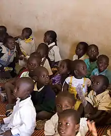 The Constitution mandates free and compulsory primary education in the Gambia, but a lack of resources and education infrastructure has made implementation difficult.[1] In 1995, the gross primary enrollment rate was 77.1 percent and the net primary enrollment rate was 64.7 percent.[1] School fees long prevented many children from attending school, but in February 1998 the president of the Gambia ordered the termination of fees for the first six years of schooling.[1] Girls make up about 40 percent of primary school students, though the figure is much lower in rural areas where cultural factors and poverty prevent parents from sending girls to school.[1] Approximately 20 percent of school-age children attend Koranic schools, which usually have a restricted curriculum.[1]