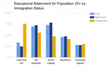 In 2016, current school enrollment figures show that immigrants lag behind native-born populations in attending pre-school and K–12 education, but they proportionally outpace native-born populations in attending colleges or universities.[1]