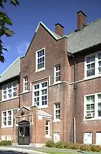 The Edward B. Newton School is a historic school building at 131 Pauline Street in Winthrop, Massachusetts. It is a large H-shaped 2+1⁄2-story brick Tudor Revival building, set on the north side of Pauline Street in central Winthrop. It was designed by William M. Bacon and built in 1908.[2] It was named after Edward B. Newton, a longtime Winthrop resident who was a member of the school committee for 17 years, who donated funds for the clock.