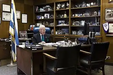 Burke is the only Chicago alderman who has Chicago police officers assigned to him as bodyguards.[141][142] In 1986, Mayor Washington's acting Chicago police commissioner Fred Rice tried to reduce the number of Burke's bodyguards from four to two, on the basis that the manpower was no longer necessary. Burke sued the city, arguing that the move was a political retaliation. The court sided with Burke.[143][144] Rice removed nearly all the aldermanic bodyguards, but was blocked by court orders from taking away the Vrdolyak and Burke contingents.[145] For nine months in 2005, the police details assigned to the city clerk, city treasurer and Burke did not file any police reports.[142] Andy Shaw, president and chief executive of the watchdog group Better Government Association, asked,