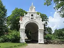 The main building is designed in the Neoclassical style and is surrounded by moats. It is a simple, two-storey white-rendered building with a rounded avant-corps towards the garden. Windows and doors have sandstone framing.[4] The building is topped by a hip roof with black-glazed tiles.[3]