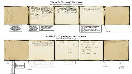 "Valuable Discovery"[4]16 cm × 22 cm (6.3 in × 8.7 in)Small 24-page notebook (21 blank pages) of copied Egyptian characters from a now non-extant version the Book of the Dead for Amenhotep.[5] The front cover says, "Valuable Discovery of hiden reccords that have been obtained from the ancient buring place of the Egiyptians", and is then signed by Joseph Smith Jr.Oliver Cowdery (English text, likely Egyptian characters), Frederick G. Williams (redaction), Joseph Smith (signature)Early July 18356