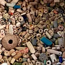 Three methods have been hypothesized to shape the body of faience objects: modeling, moulding and abrasion, the last being used in conjunction with the first two.[7] Modeling, scraping and grinding are the techniques most widely used in earlier times, as represented in the material qualities of Predynastic and Protodynastic faience objects.[10] Predynastic bead manufacture is essentially a cold technology, more akin to stone working than glass: a general form of faience is modeled, possibly free formed by hand, then holes are drilled to create beads.[10] In the Middle Kingdom, the techniques employed are molding and forming on a core, sometimes in conjunction with intermediate layers between the glaze and the body.[14] Marbleized faience, resulting from the working of different colored faience bodies together, so as to produce a uniform adherent body, also appears in this period.[12][14] Towards the end of the Middle Kingdom, incising, inlaying and resisting techniques appear: these were bound to become progressively popular towards the New Kingdom.[14] In the New Kingdom, beads, amulets and finger rings are produced by a combination of modeling and molding techniques.[14] In this period, sculptural detail is created using inlays of different colored faience or by scraping the body to reveal the white intermediate layer in relief.[14] Moulding was first applied to faience manufacture in the Middle Kingdom by forming a model of an object, or employing a finished faience piece, impressing it in wet clay, and later by firing the clay to create a durable mold.[10][19] The faience paste could then be pressed into the mold, and following drying, be re-worked through surface abrasion before firing.[10] Moulds could facilitate mass production of faience objects such as amulets rings and inlays, as evidenced by the several thousand of small open face, earth-ware clay molds excavated at Tell el Amarna.[13] The level of standardisation that use of moulds produced varied, with a compositional and morphological study of faience ushabtis suggested that mass-production is an oversimplification of a complex process that may more accurately described as batch-processing.[20]