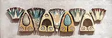 Ptolemaic and Roman faience tends to be typologically and technologically distinct from the earlier material: it is characterized by the widespread use of moulding and high relief on vessels.[22] A very unusual and finely made group of figures of deities and falcons in the Metropolitan Museum of Art in New York, apparently representing hieroglyphs that are elements from a royal inscription, perhaps from a wooden shrine, is decorated in a form of champlevé (typically a technique for enamel on metal). Depressions in the faience body were filled with coloured "vitreous pastes" and refired, followed by polishing.[23]