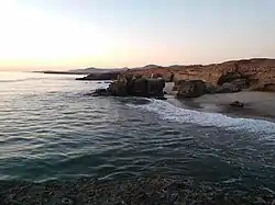 However, in spite of this Eréndira is an isolated and undeveloped beach. While it has areas with the rough, cold seas common on the Pacific side of Baja California, it also has very calm days where the Ocean is very relaxed. There are rocky outcroppings that form pools of seawater that is protected from the open ocean, and a wide array of sandy beaches. The Fishing and local surf breaks are world class. Nearby there is an area that had been used by pre-historic peoples that gathered seasonally here to collect shellfish such as clams, sea snails, mussels and other. They left a layer of shells over eight meters thick that Canadian archeologists have dated back over 10,000 years.[2]