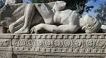 Meanwhile, between the first and fourth centuries CE, one of the largest known cemeteries of the region grew in El Buss with more than forty tomb complexes, at least 825 graves and the physical remains of almost 4,000 individuals.[15] The marble sarcophagi, which were imported from Greece and Asia Minor, and the other tombs of the monumental necropolis spread on both sides of the road leading to the triumphal arch over a kilometer in length.[16] It is unclear how far the burial grounds extended, but researchers argue that large parts of the modern camp could well have been part of the necropolis. Whereas the Phoenician funeral practices of an egalitarian ideology concealed social differences, the Roman graves did the opposite: