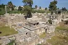 Before the landscape changed though, the Phoenician funerary site of El Buss was still used during the Hellenistic era.[8] In addition, the area just neighbouring to the North, now known as Jal Al Bahr, became a burial ground, as recent excavations have shown.[12] To the South of it, a sanctuary dedicated to the Olympian deity of Apollo was constructed, possibly still at the end of the Hellenistic era[10] or latest in the first century CE:[13]